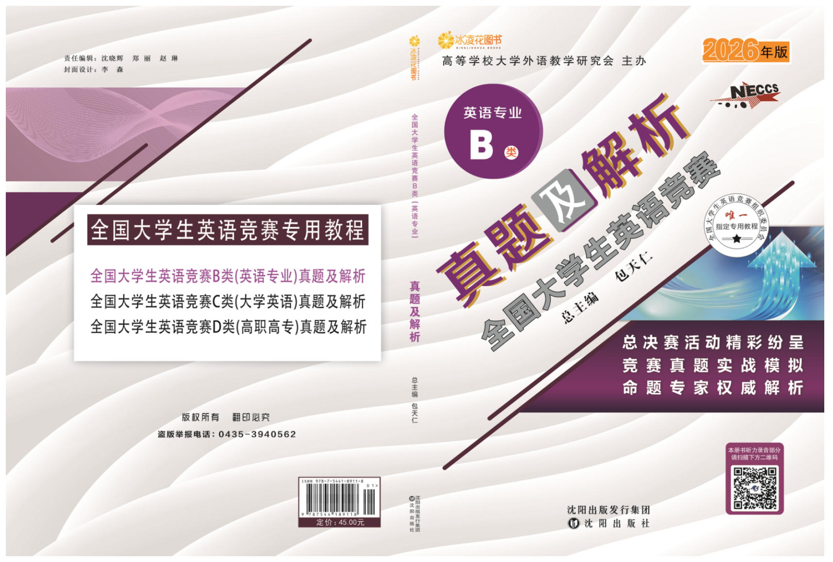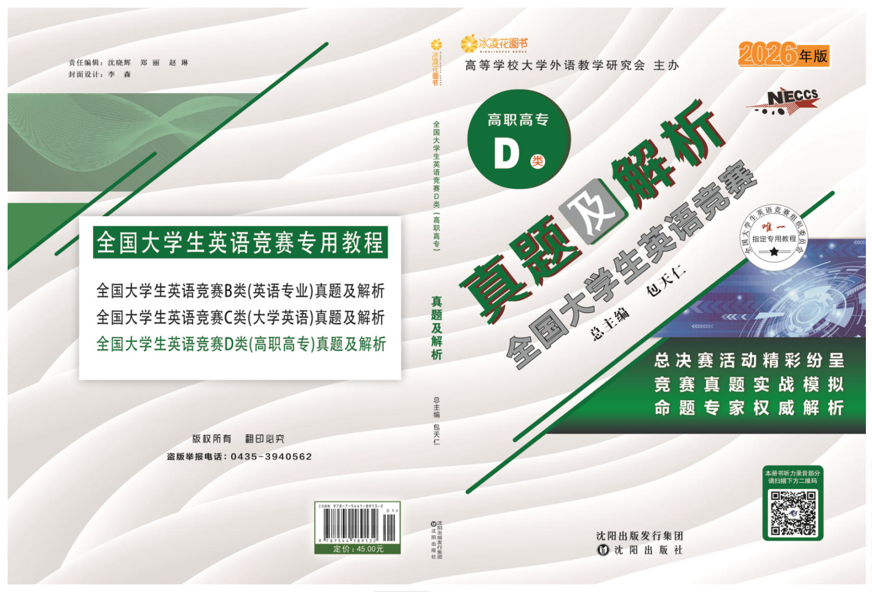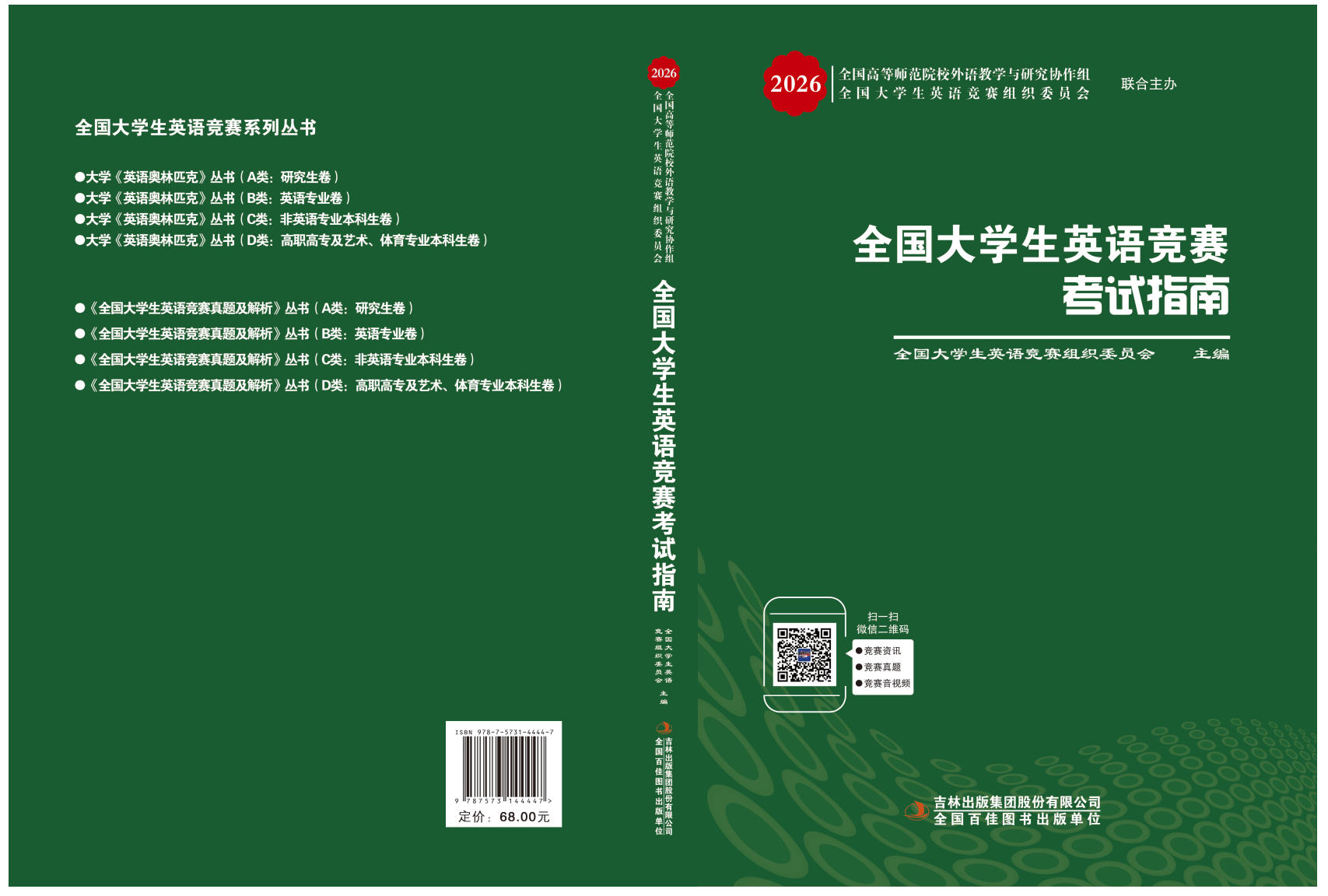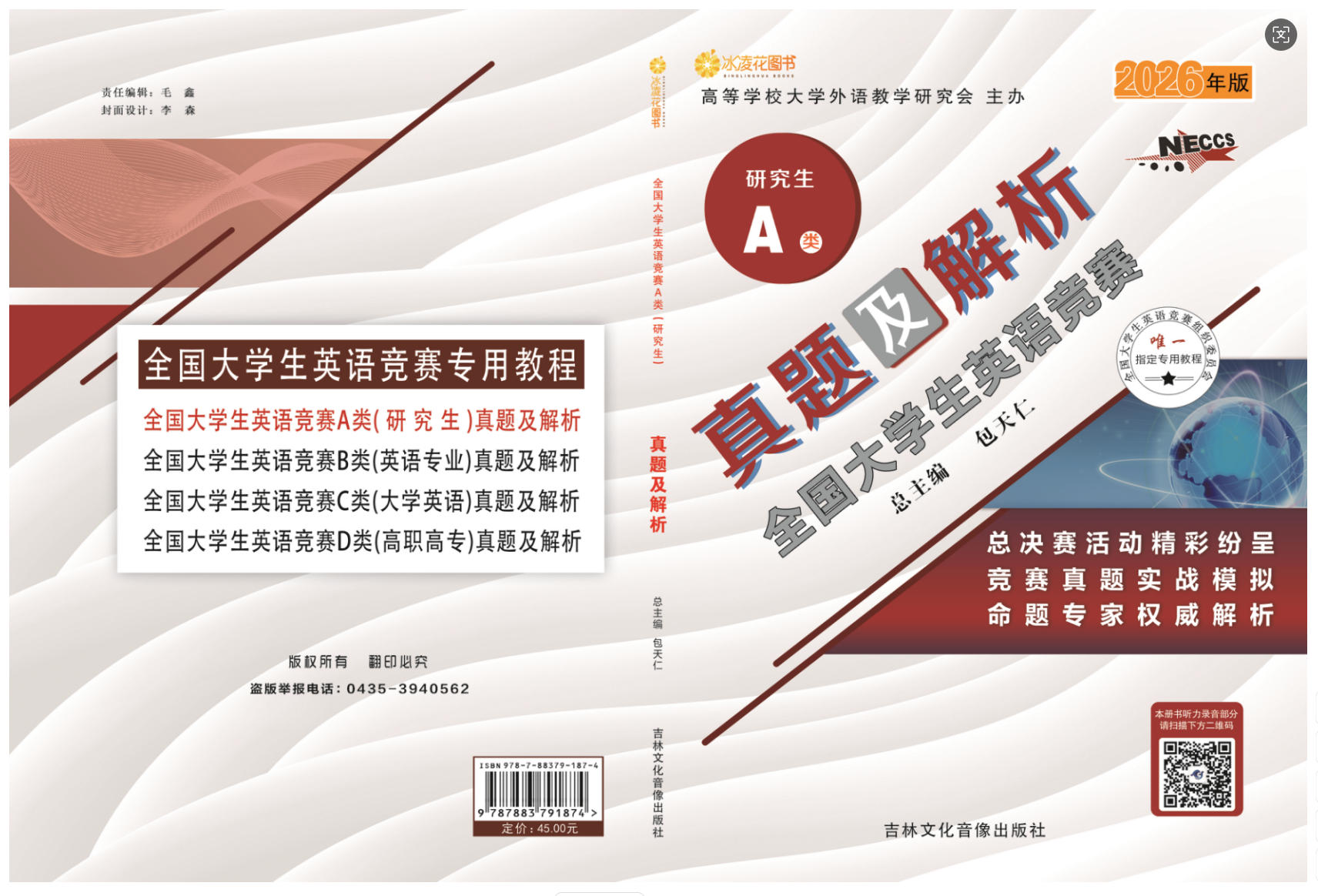 3.2026年新版《全国大学生英语竞赛真题及解析》丛书由包天仁教授任总主编,由吉林文化音像出版社出版,该套丛书包含四个分卷:研究生卷(A类研究生),英语专业卷(B类英语专业本、专科学生),大学英语本科卷(C类非英语专业本科生),高职高专卷(D类体育类和艺术类本科生及非英语专业高职高专类学生)。各卷单册定价均为45.00元,并附赠光盘一张。该套丛书收集了2023-2025年全国大学生英语竞赛的全部初、决赛真题,并就重、难点进行了精辟的分析和解答,是参加全国大学生英语竞赛之前热身训练之必备。