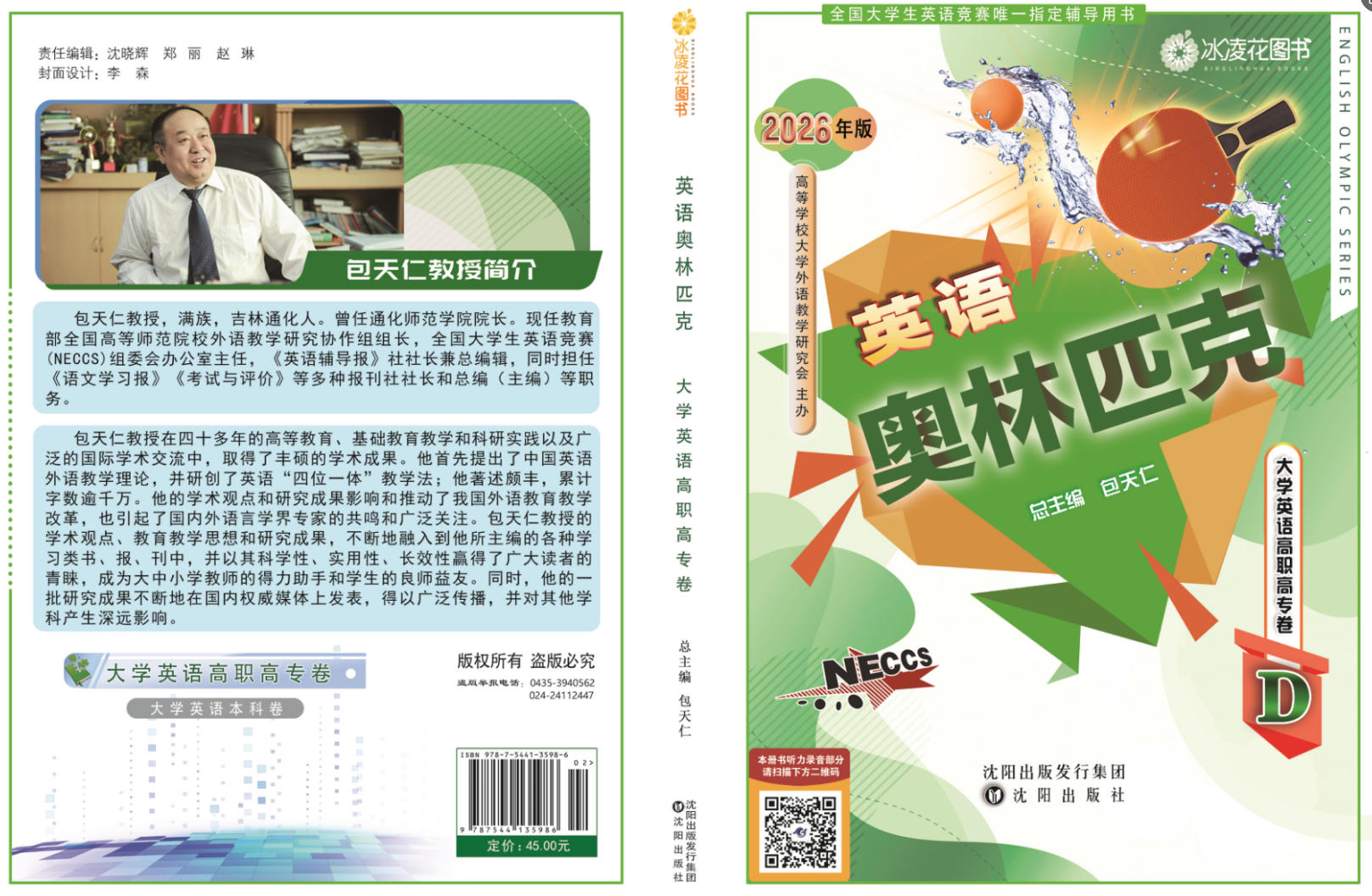 2.2026年新版大学《英语奥林匹克》丛书由包天仁教授任总主编,由沈阳出版社出版,该套丛书包含四个分卷:研究生卷(A类研究生),英语专业卷(B类英语专业本、专科学生),大学英语本科卷(C类非英语专业本科生),高职高专卷(D类体育类和艺术类本科生及非英语专业高职高专类学生)。各卷单册定价均为45.00元,并附赠光盘一张。该套丛书对英语词汇、语法等基础知识作了分类辅导,并配有适量的单项、专项和综合练习,同时还介绍了解答各种竞赛题型的方法、思路,并配有竞赛样题一套及竞赛模拟试题三套。该套丛书不仅是备考全国大学生英语竞赛的参考用书,也是大学生平时英语学习、训练和参加各种国内外英语考试较为理想的参考材料。