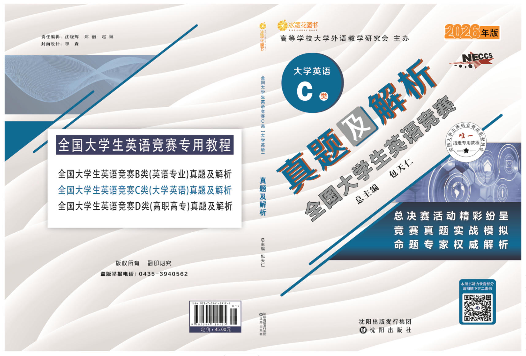 3.2026年新版《全国大学生英语竞赛真题及解析》丛书由包天仁教授任总主编,由吉林文化音像出版社出版,该套丛书包含四个分卷:研究生卷(A类研究生),英语专业卷(B类英语专业本、专科学生),大学英语本科卷(C类非英语专业本科生),高职高专卷(D类体育类和艺术类本科生及非英语专业高职高专类学生)。各卷单册定价均为45.00元,并附赠光盘一张。该套丛书收集了2023-2025年全国大学生英语竞赛的全部初、决赛真题,并就重、难点进行了精辟的分析和解答,是参加全国大学生英语竞赛之前热身训练之必备。